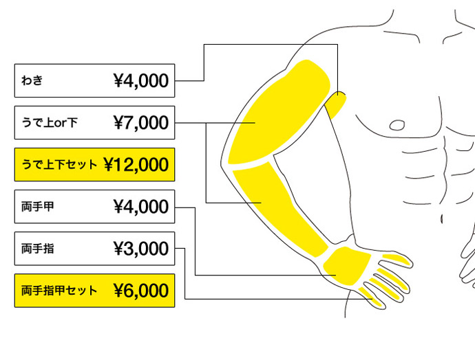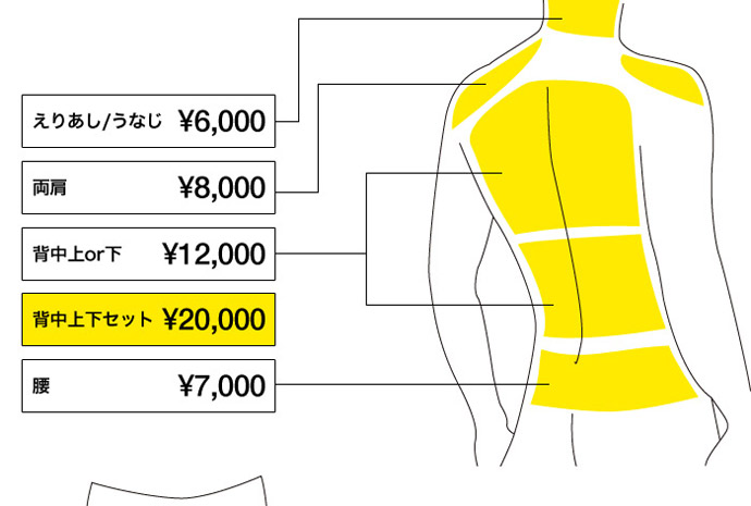 ※下の図はおおまかな施術部位を記しています。料金表に記載の無い部位等はお問合せ下さい。